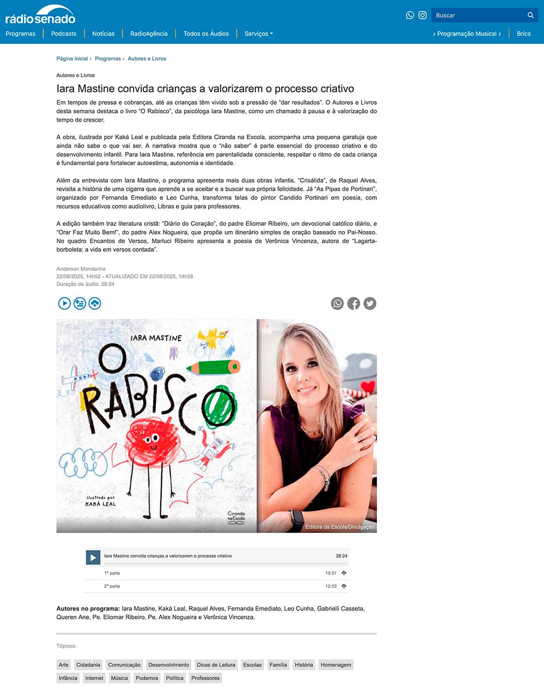 16 out Rádio Senado – Iara Mastine convida crianças a valorizarem o processo criativo Posted at 11:08h in Na Mídia by Iara Mastine 0 Comments